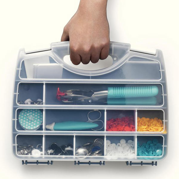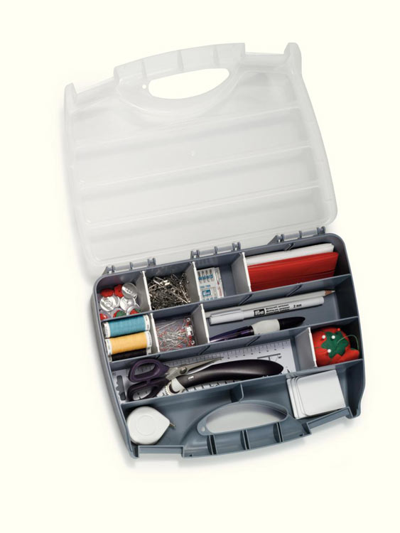 Идеально подходит для хранения принадлежностей для шитья и рукоделия. Пуговицы, нитки, иголки, бусы и даже ножницы – каждый аксессуар найдет свое место. Благодаря вставным перегородкам, которые позволяют гибкое разделение ячеек, возможно все. Для мелких деталей можно использовать до 17 отделений. Благодаря белой застежке-клипсе содержимое надежно закрыто, даже во время транспортировки органайзера. Бокс изготовлен из прочного пластика, нижняя часть серого цвета, а крышка прозрачная. Ножки из пластика гарантируют высокую стабильность – в горизонтальном или вертикальном положении.